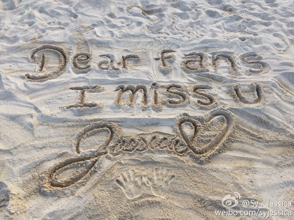 Jessica včera na svoj Weibo účet zaslala fotku nápiu, ktorý sama napísala do piesku. Bol určený jej fanúšikom a znel: "Drahí fanúšikovia, chýbate mi. - Jessica - " Navyše pridala aj odtlačky svojich rúk a za svojím menom napísala srdiečko vychádzajúce z posledného písmenka jej mena.